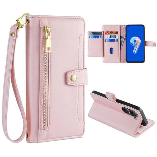 Funda de Cuero para Asus Zenfone 9 y Zenfone 9Z Cross-Body Zipper Wallet (Rosa)
