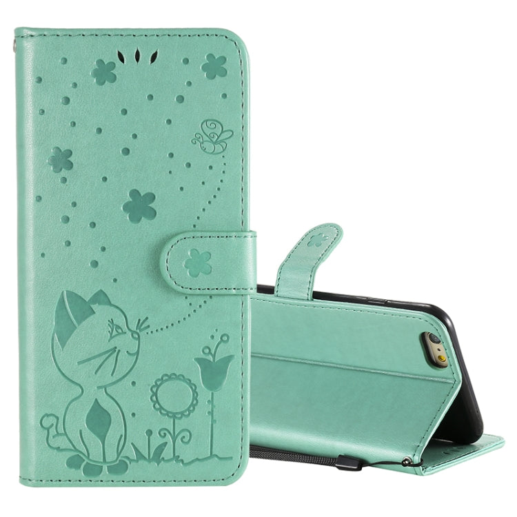 Funda de Cuero iPhone 6 Plus Patrón Gato Abeja Relieve a Prueba de Golpes Horizontal con Sostenedor y Ranuras para Tarjetas (Verde)