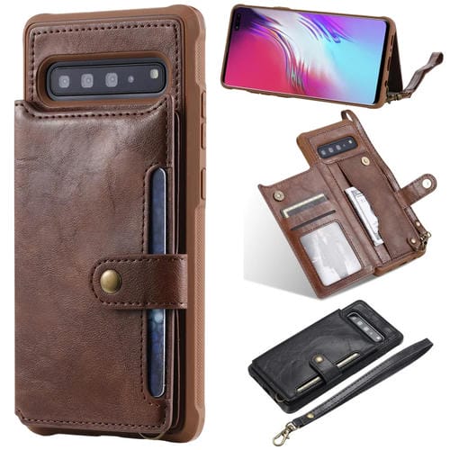 Estuche Protector Galaxy S10 5G con Cremallera Hebilla Soporte Ranuras Tarjetas Billetera Cordón Marco Fotos (Café)