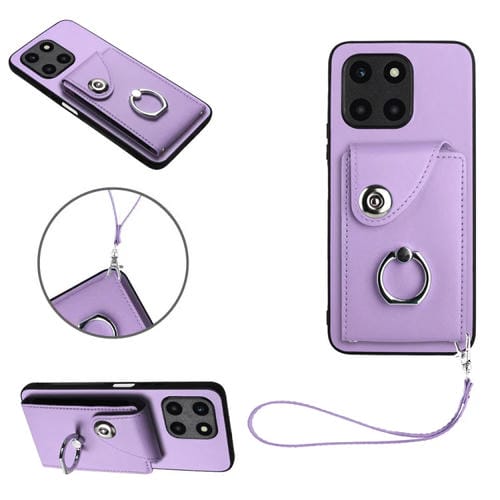 For Honor X6a Global Organ Card Bag Ring Holder PU Phone Case with Lanyard(Purple)