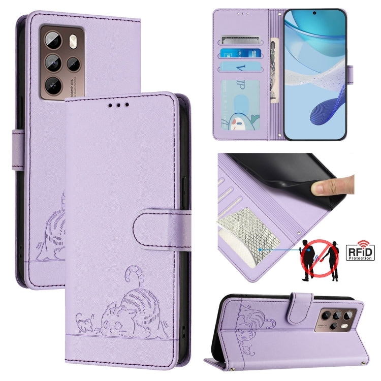 Funda para Teléfono HTC U24 Pro CAT Rat de Cuero Rfid con Patrón en Relieve y Cordón (Púrpura)