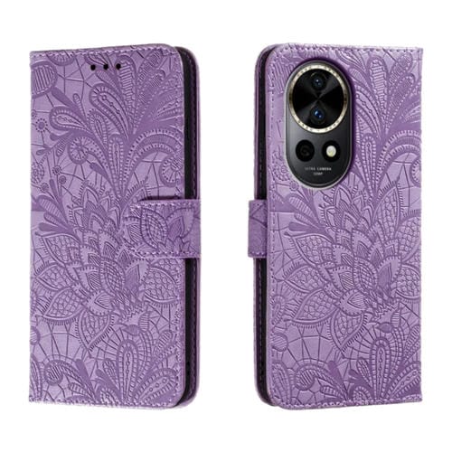 - 1x Funda de Cuero para Huawei Nova 12 Pro con Tapa y Estampado de Flores de Encaje (Púrpura)