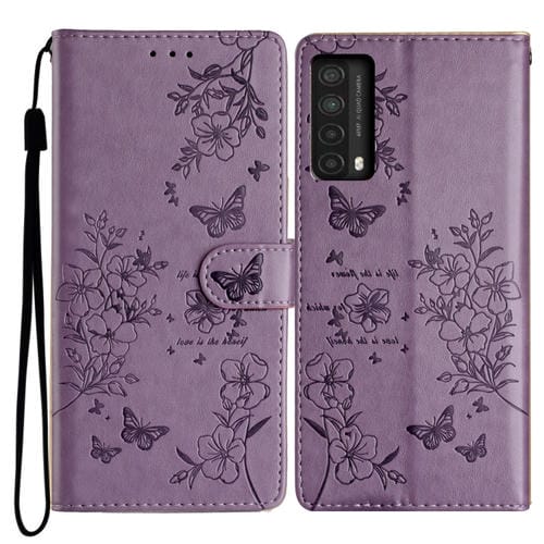 Funda para Huawei P Smart 2021 y Y7A de Cuero con Relieve Flor y Mariposa (Púrpura)