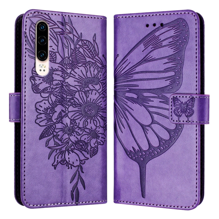 Funda de Cuero para Huawei P30 con Mariposa en Relieve (Púrpura)