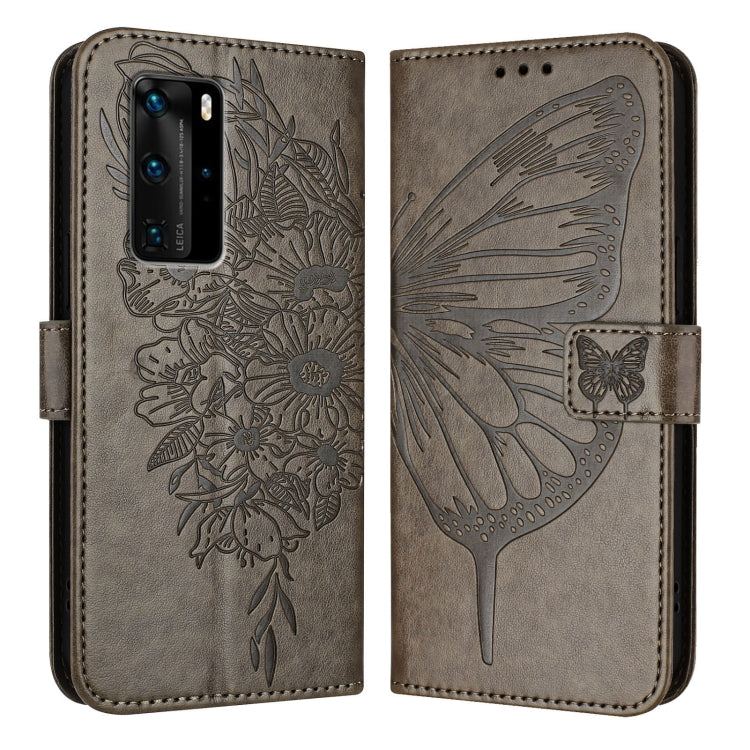 Funda de Cuero para Huawei P40 Pro con Mariposa en Relieve (Gris)