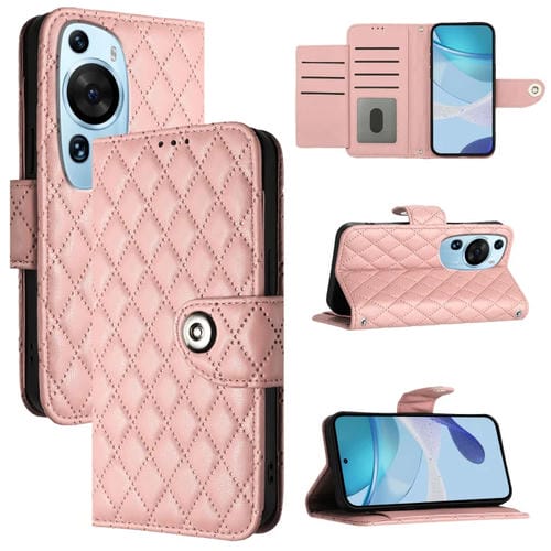 - 1x Funda de Cuero con Tapa y Cordón para Huawei P60 Art Rhombic Texture (Rosa Coral)