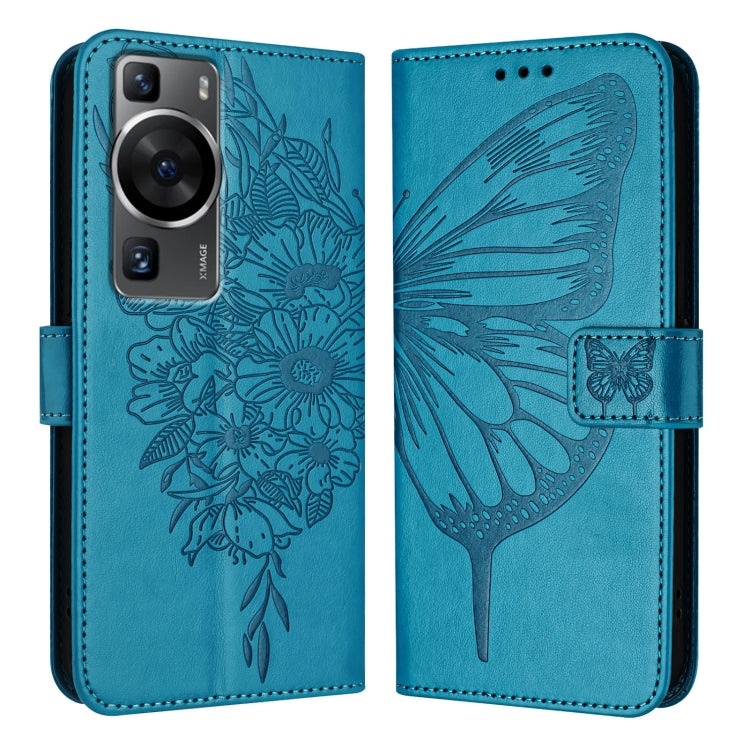 Funda de Cuero para Huawei P60 y P60 Pro con Mariposa en Relieve (Azul)