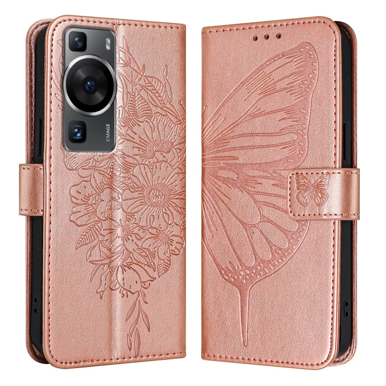 Funda de Cuero para Huawei P60 y P60 Pro con Mariposa en Relieve (Oro Rosa)