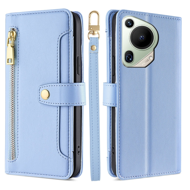 Funda de Cuero para Huawei Pura 70 Ultra 5G con Billetera, Cremallera y Textura de Oveja (Azul)