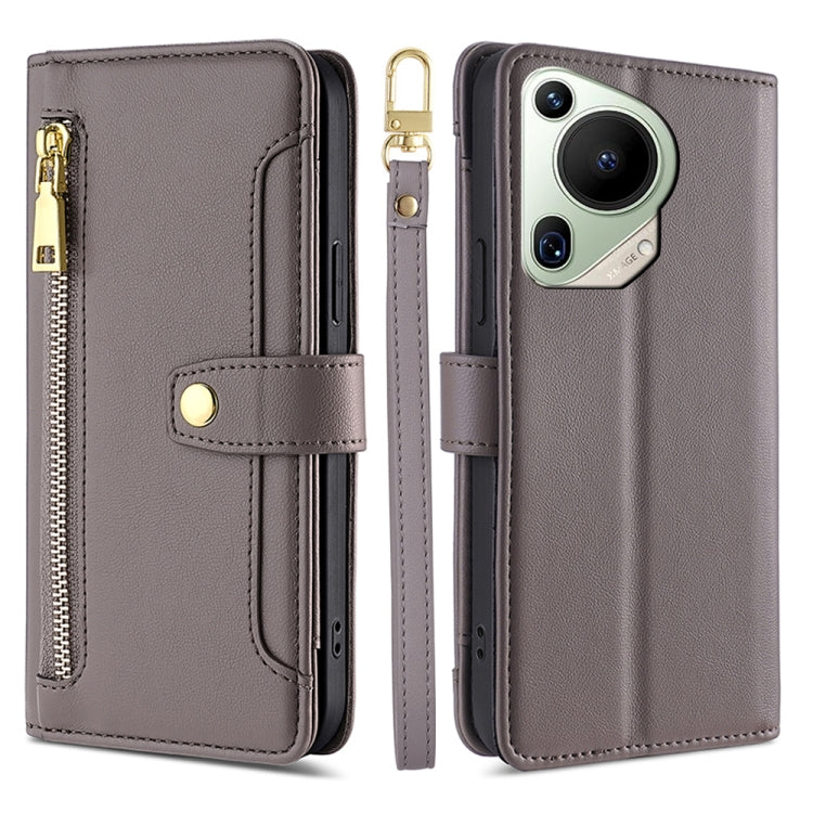Funda de Cuero Huawei Pura 70 Ultra 5G con Billetera, Cremallera y Textura de Oveja (Gris)