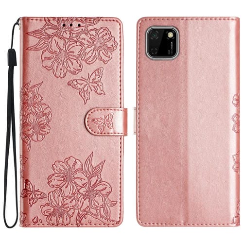 - 1x Funda para Huawei Y5P y Honor 9S Cherry Blossom Butterfly Skin Feel PU en Relieve (Oro Rosa)