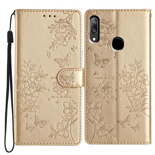 Funda para Huawei Y6 2019 de Cuero con Relieve Flor de Amor y Mariposa (Dorado)