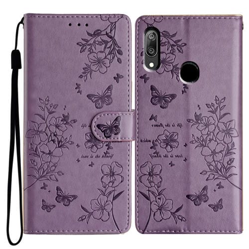 Funda para Huawei Y6 2019 de Cuero con Relieve de Flor y Mariposa (Púrpura)