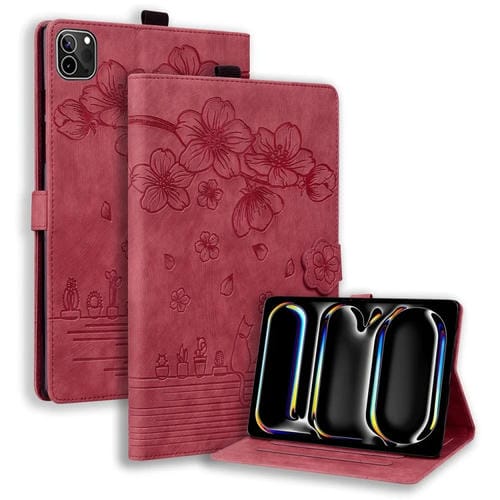 Funda para Tableta iPad Pro 13 2024 Cuero Inteligente Relieve Gato Sakura (Rojo)