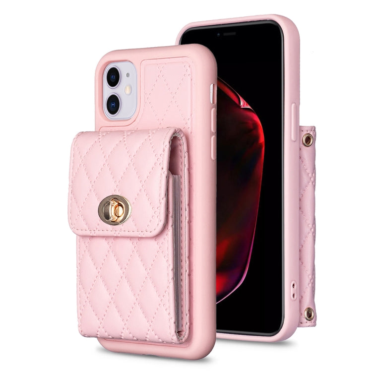 Caja de Teléfono de Cuero Rómbica para iPhone 11 Billetera con Hebilla de Metal Vertical (Rosa)