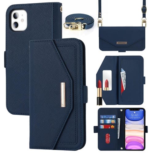 Funda para iPhone 11 Cross Texture Lanyard de Cuero con Correa (Azul)