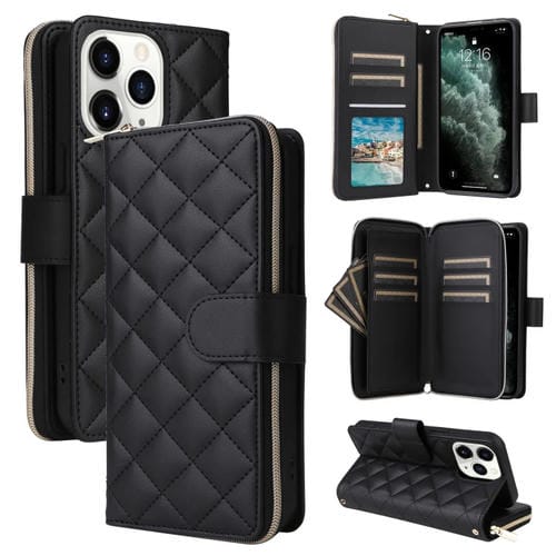 Funda para Teléfono iPhone 11 Pro Cuero Hebilla Torre Cremallera Rombal Cruzada con Cordón (Negro)