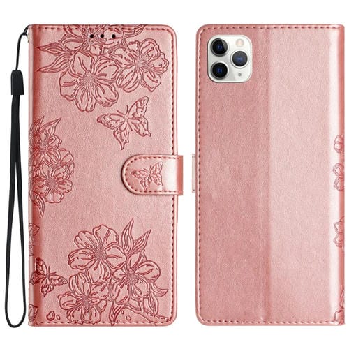 Funda para iPhone 11 Pro Max Cherry Blossom Butterfly Skin Feel de PU en Relieve (Oro Rosa)