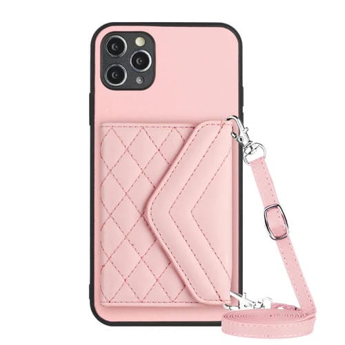 Estuche para Teléfono iPhone 11 Pro Max Rfid con Bolsa para Tarjetas Textura Rómbica y Cordón Largo (Oro Rosa)