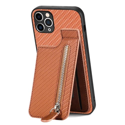 Pour iPhone 11 Pro Max Étui de téléphone à fermeture éclair verticale en fibre de carbone (marron)
