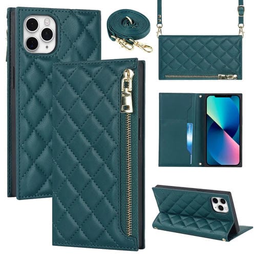 Funda de Cuero para iPhone 11 Pro Max Grid Texture con Lanyard y Cremallera (Verde)