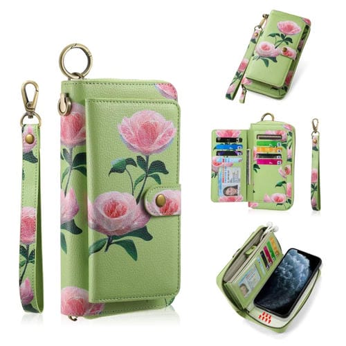 Funda de Cuero Pola Flower para iPhone 11 Pro Max con Billetera y Cremallera Multifuncional (Verde)