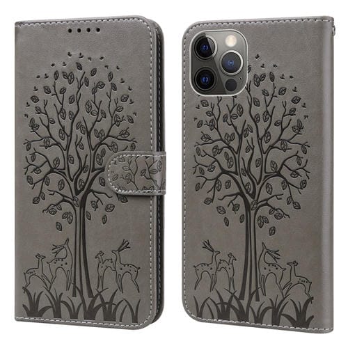Funda de Cuero para iPhone 11 Pro Max Tree & Deer Patrón Prensado Impresión Horizontal Flip (Gris)