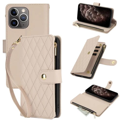 Funda para iPhone 11 Pro Max Ym016 Cuero con Billetera, Tarjeta, Cremallera Rómbica y Cordón (Albaricoque)