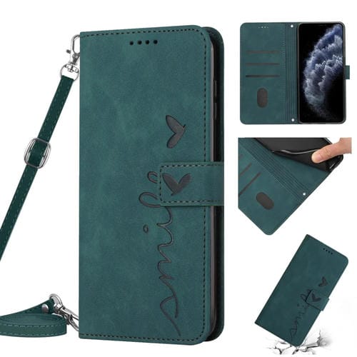 Funda para iPhone 11 Pro Skin Feel Heart Pattern de Cuero con Cordón (Verde)