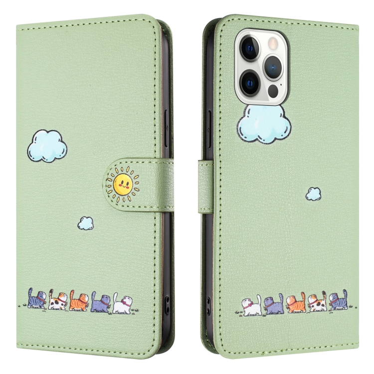 Funda para Teléfono iPhone 12/12 Pro Cuero con Gatos de Dibujos Animados (Verde)
