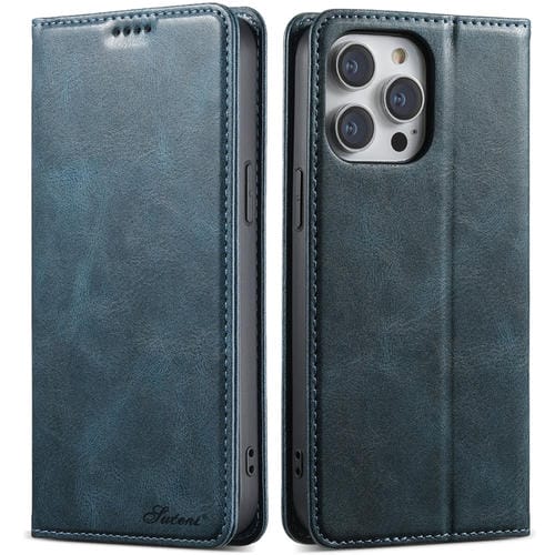 Funda de Cuero Suteni J02 para iPhone 12/12 Pro con Billetera de Cera de Aceite (Azul)