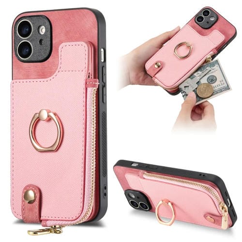 For iPhone 12 Vertical Zipper Wallet Phone Case with Crossbody Leather Ring Holder (Pink)