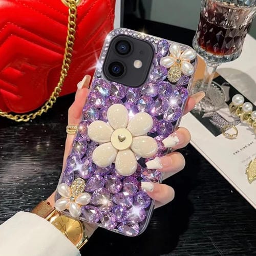 Funda para Teléfono iPhone 12 con Soporte de Girasol y PC con Diamantes Colocados a Mano (Púrpura)
