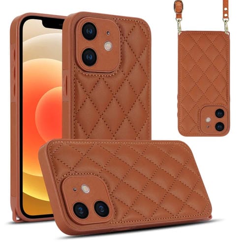 Funda para Teléfono iPhone 12 Textura Rómbica Cordón Doble (Marrón)