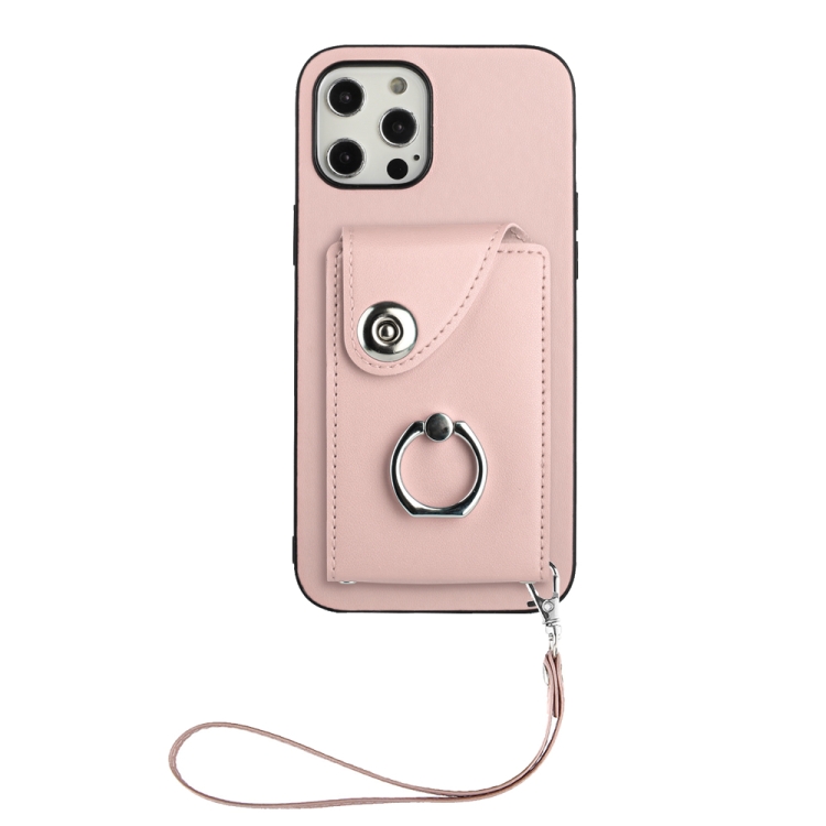 Funda para Teléfono iPhone 12 de PU con Soporte para Anillo y Bolsa para Tarjeta con Cordón (Rosa)