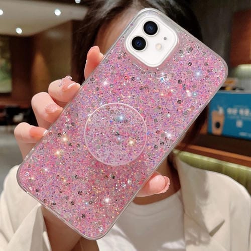 Funda para Teléfono TPU Epoxi para iPhone 12 con Soporte Redondo y Lentejuelas Estrelladas (Rosa)