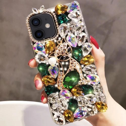 Funda para Teléfono Fox para iPhone 12 Hecha a Mano con Diamantes de Imitación y Piedras Preciosas para PC (Verde)