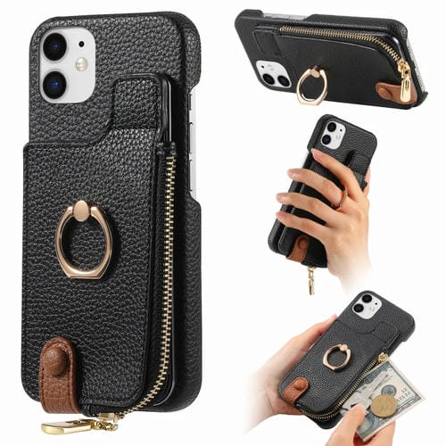 Funda Trasera para iPhone 12 con Billetera, Cremallera y Anillo de Cuero Litchi (Negro)