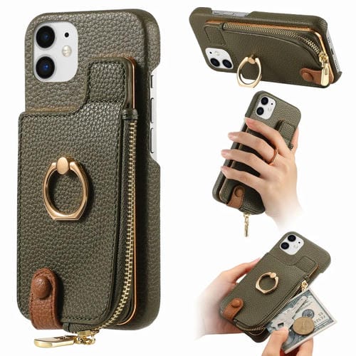 Funda Trasera para iPhone 12 con Billetera, Cremallera y Anillo de Cuero Litchi (Verde)
