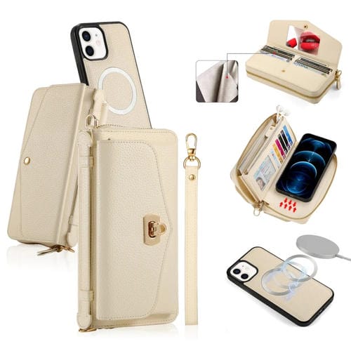 Funda para Teléfono iPhone 12 Magsafe Crossbody Cartera Multifuncional con Cremallera Cuero Litchi (Blanco)