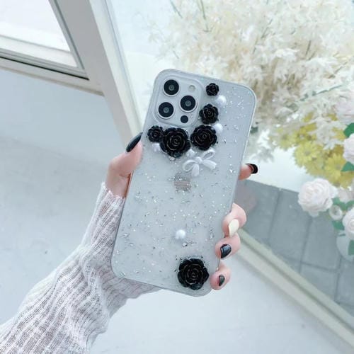 Funda para iPhone 12 Mini TPU 3D Pearl Bow Rose Glitter Epoxy (Negro)