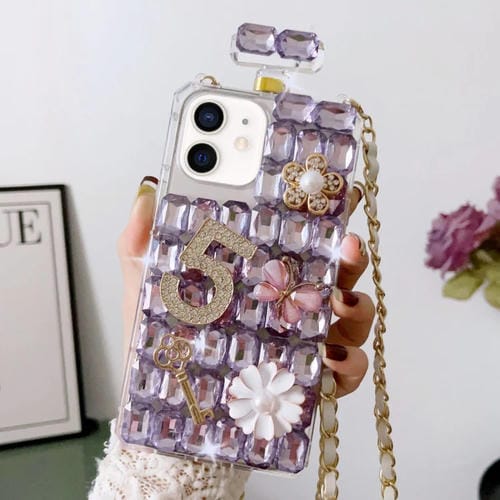 Funda para iPhone 12 Mini PC Botella de Perfume Cruzada con Incrustaciones de Diamantes (Púrpura)