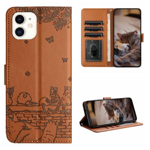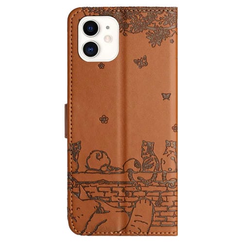Funda para iPhone 12 Mini Cat Relieve Patrón Cuero con Cordón (Marrón)