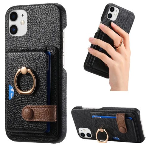 Funda para Teléfono iPhone 12 Mini Parte Posterior de Tarjeta Anillo Borde Aceite Cuero Litchi (Negro)