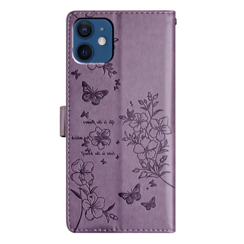 Funda para Teléfono iPhone 12 Mini Cuero Relieve Flor de Amor y Mariposa (Púrpura)