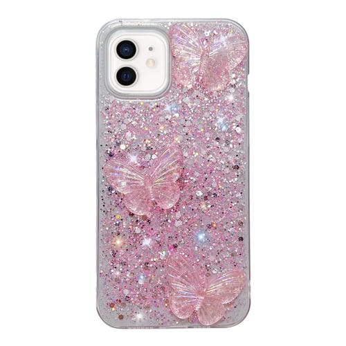 Funda para Teléfono TPU Epoxi iPhone 12 Mini con Mariposas de Cristal y Lentejuelas Estrelladas (Rosa)