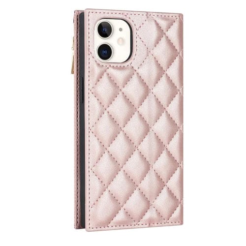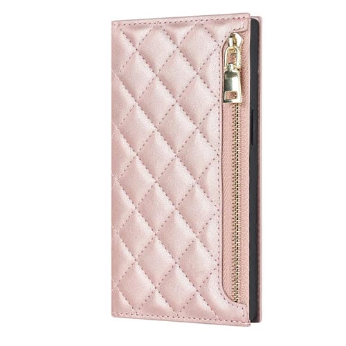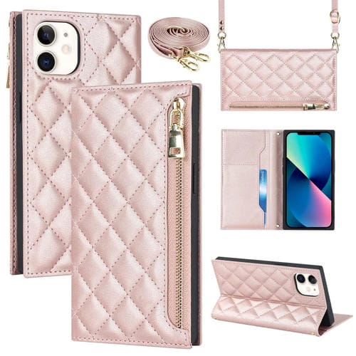 Funda de Cuero para iPhone 12 Mini Grid Texture con Lanyard y Cremallera (Oro Rosa)