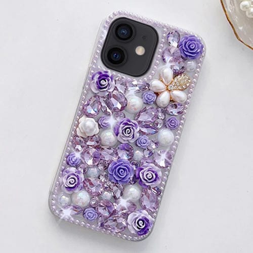 Estuche para teléfono iPhone 12 Mini Rose con diamante para PC montado a mano (Púrpura)