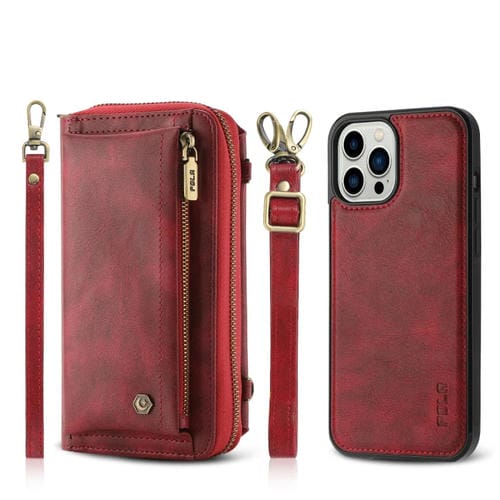 Funda de Cuero Crossbody para iPhone 12 Pro con Billetera y Cremallera Multifuncional (Rojo)
