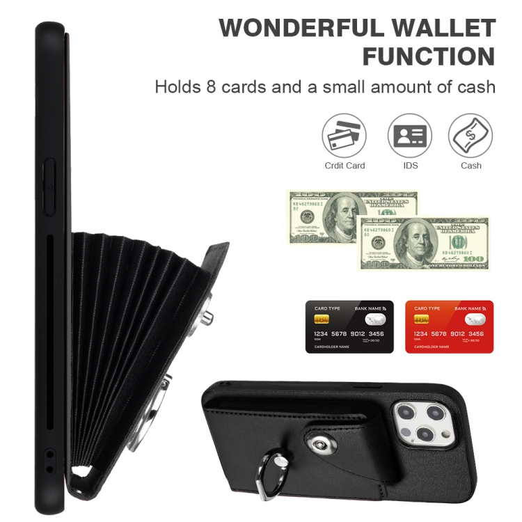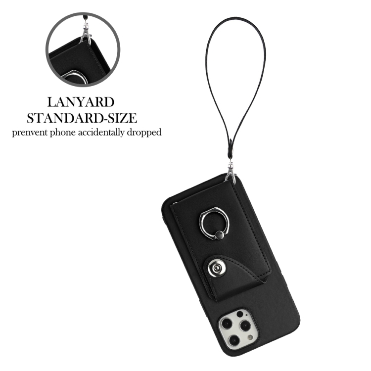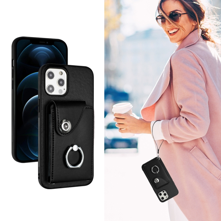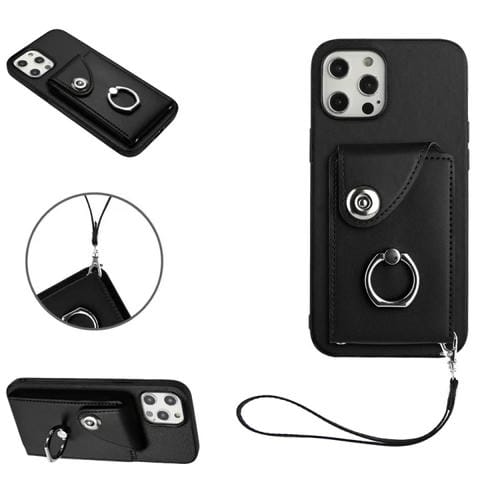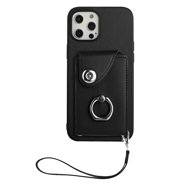 Funda para Teléfono iPhone 12 Pro de PU con Soporte para Anillo y Bolsa para Tarjeta con Cordón (Negro)